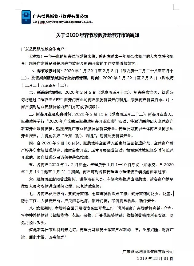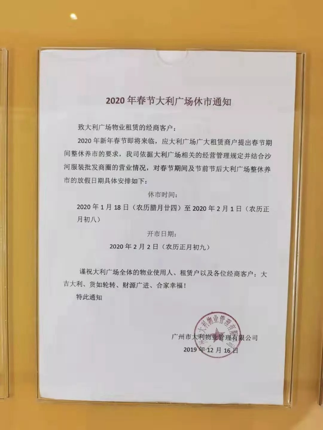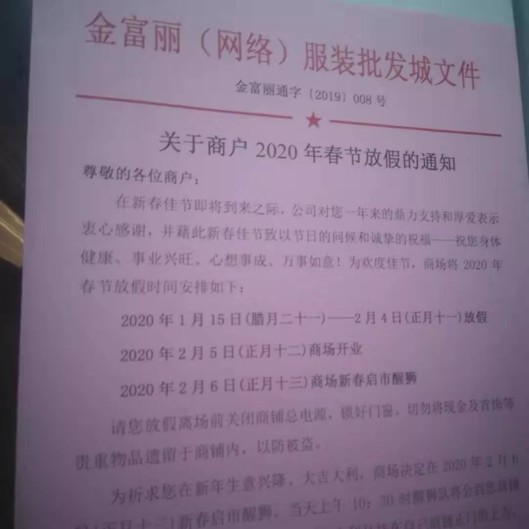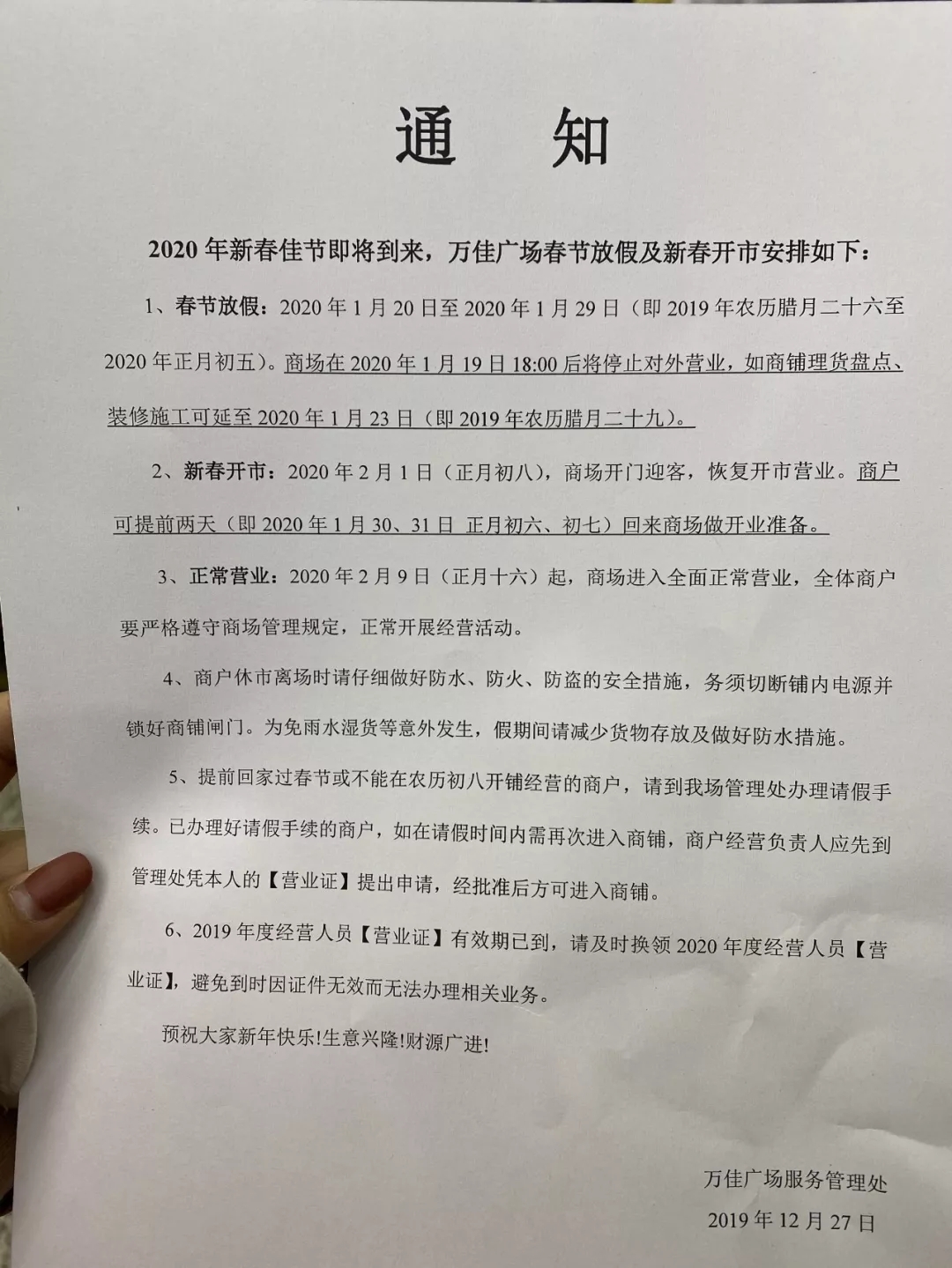 放假時(shí)間:2020年1月15日(農(nóng)歷臘月廿一)至2020年2月4日(農(nóng)歷正月十一)。2020年2月5日(農(nóng)歷正月十二)商場(chǎng)正式開門營業(yè)。