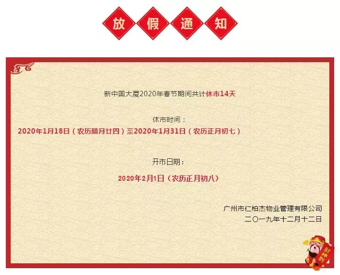 放假時(shí)間:2020年1月18日(農(nóng)歷臘月廿四)至2020年2月1日(農(nóng)歷正月初八)。2020年2月2日(農(nóng)歷正月初九)開市營業(yè)。