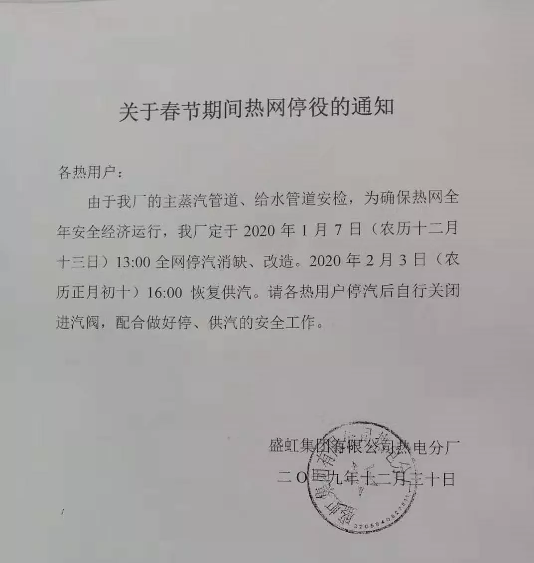 盛澤地區主要的熱電廠發出春節放假停汽通知,將于2020年1月7日13時全網停汽,2020年2月3日16時恢復供汽。