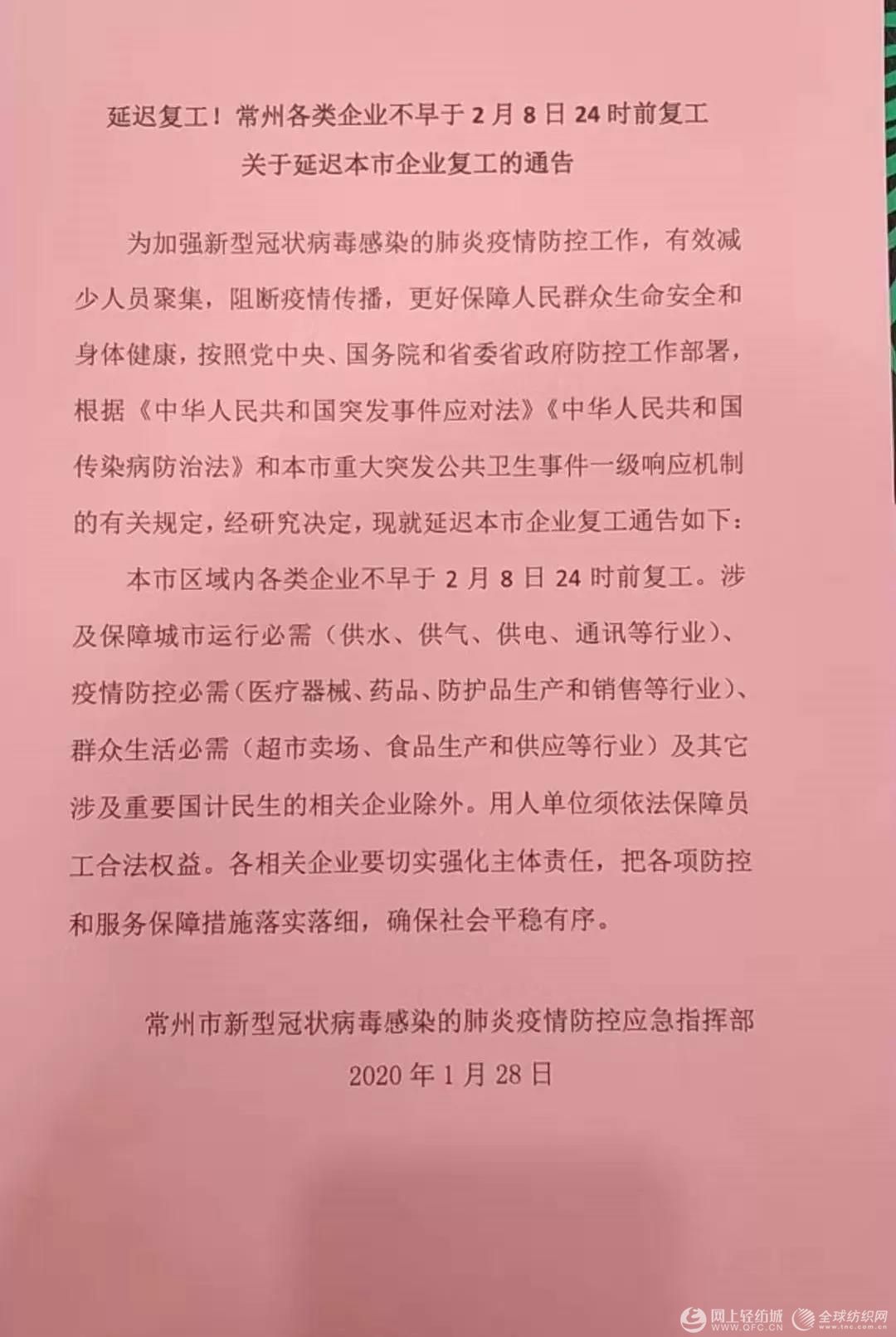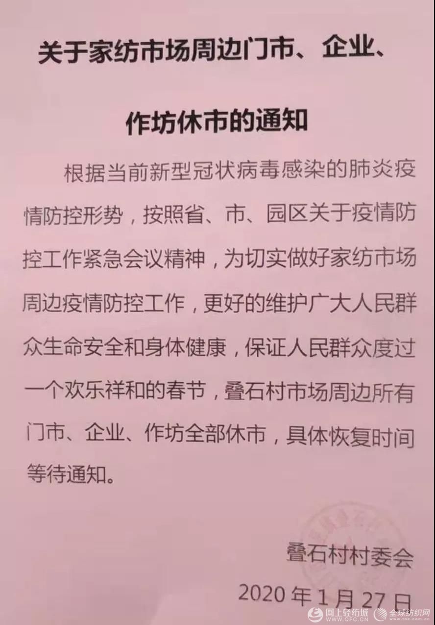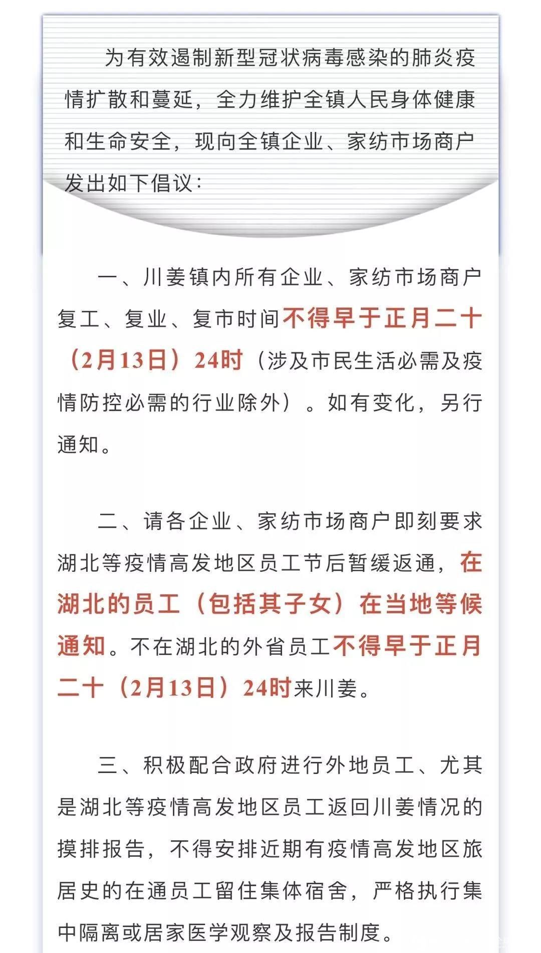 南通川姜鎮內所有企業、家紡市場商戶復業、復市時間不得早于正月二十(2月13日)24時!