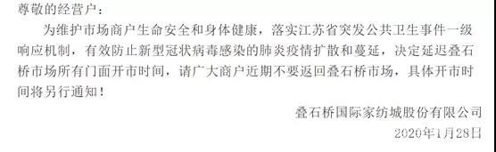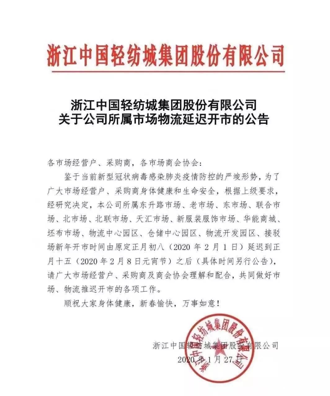 中國輕紡城延遲至2月8日之后開市,具體時間另行公告!