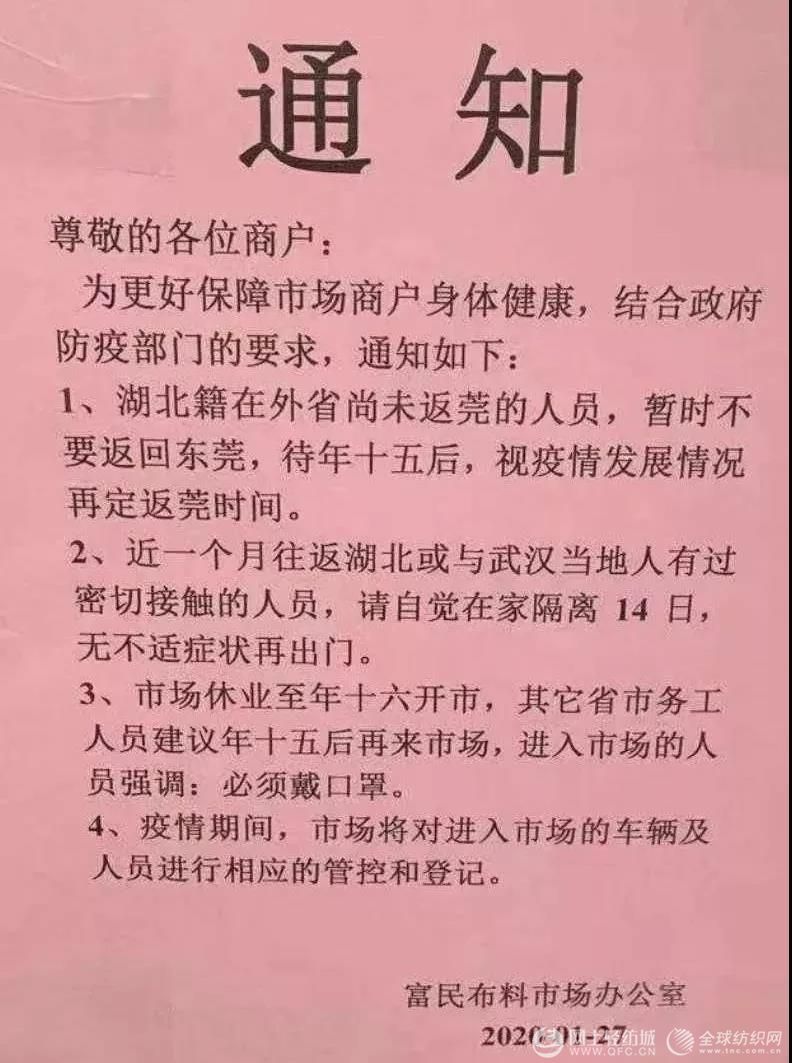 鑒于當前新型冠狀病毒感染肺炎疫情的防控形勢非常嚴竣,浙江中國輕紡城、吳江盛澤中國東方絲綢市場、廣州中大及周邊制衣集中地、無錫、寧波申洲集團等各大紡織品交易、生產地集群或企業針對春節節后開市復工時間做出積極響應。