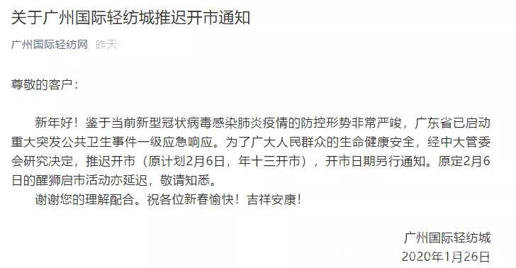 廣州國際輕紡城發布公告稱:推遲開市(原計劃2月6日,年十三開市),開市日期另行通知。
