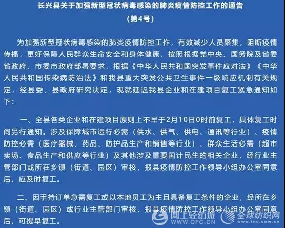 長興各類企業原則上不早于2月10日0時前復工,具體復工時間另行通知。