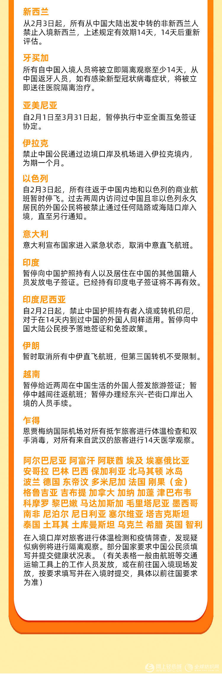 受突發新型冠狀病毒肺炎影響,除中國外,世界各國也相繼發現了確診病例,隨后多國多地陸續出臺了宣布針對中國旅客的入境管制政策,以下是最新世界各國和地區的入境限制政策: