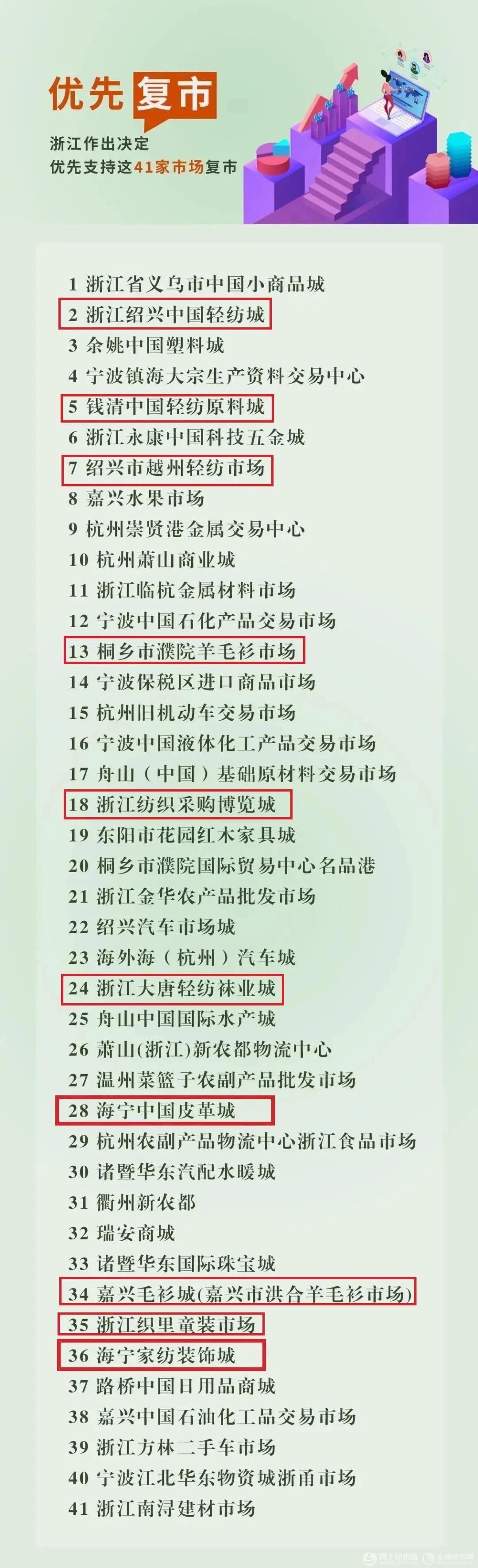 2月20日,《浙江省新型冠狀病毒肺炎疫情防控工作領(lǐng)導小組辦公室關(guān)于統(tǒng)籌推進商品市場安全開業(yè)運行與新業(yè)態(tài)新模式發(fā)展的指導意見》出臺,優(yōu)先支持這41家市場復(fù)市!其中海寧皮革城、海寧家紡裝飾城等10家紡織市場在列!