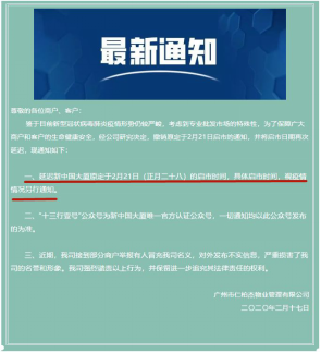 作為全國最大的一級批發市場之一--廣州十三行的復工情況也受到了紡織企業的關注。17日,廣州十三行再次發布通知:原定于2月21日啟市的計劃再推遲,具體啟市時間不定,視疫情情況另行通知。