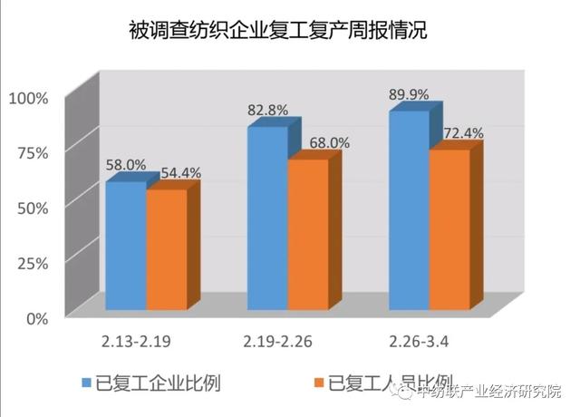 最近一周以來,紡織產(chǎn)業(yè)鏈中下游企業(yè)復(fù)工復(fù)產(chǎn)情況逐步改善,紡織服裝專業(yè)市場(chǎng)復(fù)工開市進(jìn)度有所加快,2月中下旬比較突出的產(chǎn)業(yè)鏈上下游復(fù)工不同步問題逐步得到緩解,產(chǎn)業(yè)鏈運(yùn)轉(zhuǎn)協(xié)同性正在逐漸恢復(fù)。