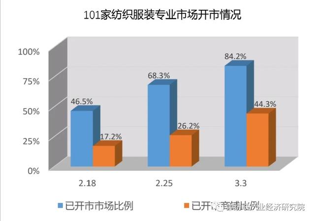 根據(jù)中紡聯(lián)流通分會(huì)3月3日對(duì)全國(guó)101家重點(diǎn)紡織服裝專業(yè)市場(chǎng)的調(diào)查數(shù)據(jù),單體市場(chǎng)開市率已經(jīng)達(dá)到84.2%,比前一周調(diào)查時(shí)提高15.9個(gè)百分點(diǎn);已開市商鋪數(shù)為3.7萬個(gè),占正常情況下市場(chǎng)商鋪總數(shù)的比例為44.3%,雖然仍有大量商品未恢復(fù)營(yíng)業(yè),但這一比例較一周前已經(jīng)提高了18.1個(gè)百分點(diǎn)。