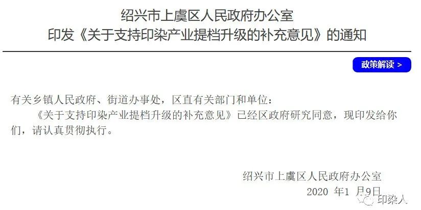 為加快印染產業提檔升級,促進生態環境優化,推進經濟高質量發展,根據紹興市不再組織認定印染行業綠色示范標桿企業實際,在《中共紹興市上虞區委辦公室 紹興市上虞區人民政府辦公室關于印發〈上虞區印染產業提檔升級工作方案〉的通知》(區委辦〔2016〕93號)、《中共紹興市上虞區委辦公室 紹興市上虞區人民政府辦公室關于支持印染產業提檔升級的政策意見》(區委辦〔2016〕94號)基礎上,特制定本補充意見。