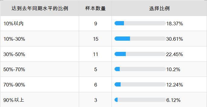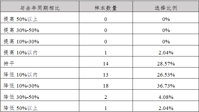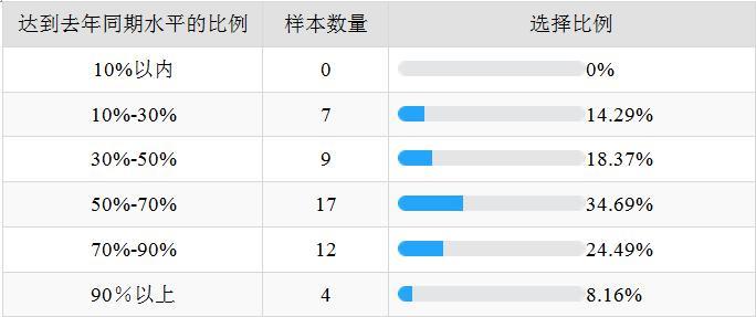 在外銷訂單方面,與去年同期相比,30.61%的樣本企業(yè)外銷訂單僅達(dá)到去年同期水平的10%~30%,22.45%的企業(yè)達(dá)到去年同期水平的30%~50%,只有6.12%的企業(yè)達(dá)到去年同期水平的90%以上。