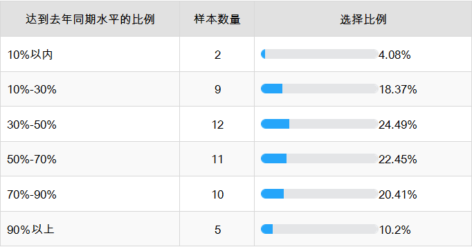 從問卷匯總信息可以看出,盡管參與調(diào)研的企業(yè)在國內(nèi)疫情基本得到控制的形勢下都已陸續(xù)復(fù)工復(fù)產(chǎn),但企業(yè)當(dāng)前的產(chǎn)能利用率整體水平偏低,超6成企業(yè)產(chǎn)能利用率未達(dá)到去年同期水平的70%,其中,達(dá)到去年同期水平50%~70%的企業(yè)比例最高,為34.69%;24.49%的企業(yè)達(dá)到去年同期水平的70%~90%,僅8.16%的企業(yè)產(chǎn)能利用率達(dá)到去年同期水平的90%以上。