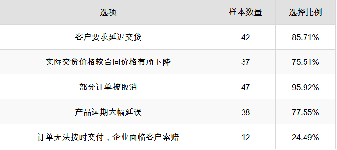 調(diào)研問卷顯示,部分訂單被取消是樣本企業(yè)當(dāng)前在銷售過程中遇到的首要問題,選擇比例高達(dá)95.92%;其次是客戶要求延遲交貨,選擇比例為85.71%;產(chǎn)品運(yùn)期大幅延誤和實(shí)際交貨價(jià)格較合同價(jià)格有所下降也是企業(yè)面臨的主要問題,選擇比例分別為77.55%和75.51%。